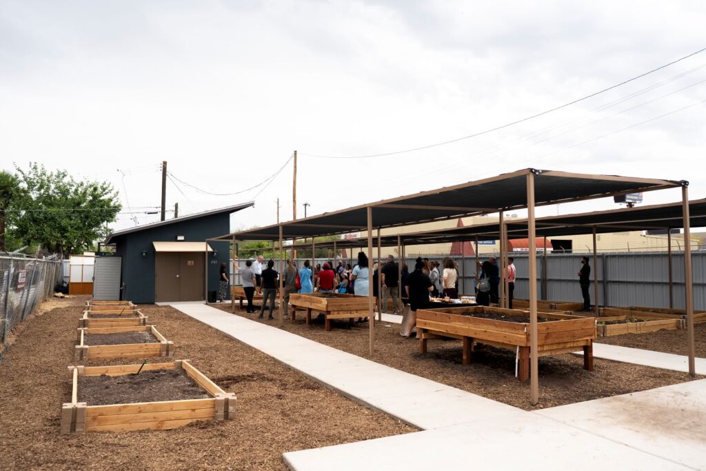 An adjacent lot has been acquired and transformed, creating space for expanded growing areas and the newly constructed Garden Education Center. The site now includes a fully equipped classroom, restrooms, ADA-accessible pathways, additional raised beds, shade structures, and an enhanced irrigation system.