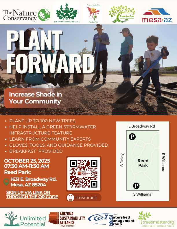 Join us in planting up to 100 trees and enhancing a basin at Reed Park to improve shade and walkability! Arizona Sustainability Alliance (AZSA), The City of Mesa, The Nature Conservancy, Trees Matter, Watershed Management Group, and Unlimited Potential invite the community to join a collaborative day of tree planting, green stormwater infrastructure, and connection at Reed Park. This event is supported by the Arizona Columbine Garden Club and the Garden Club of America.