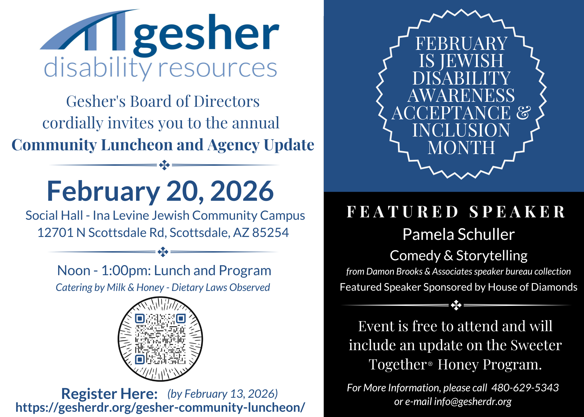 Gesher's Board of Directors cordially invites you to the annual Community Luncheon and Agency Update. Featured Speaker is Pamela Schuller, Comedy & Storytelling, from Damon Brooks & Associates speaker bureau collection. Featured ...