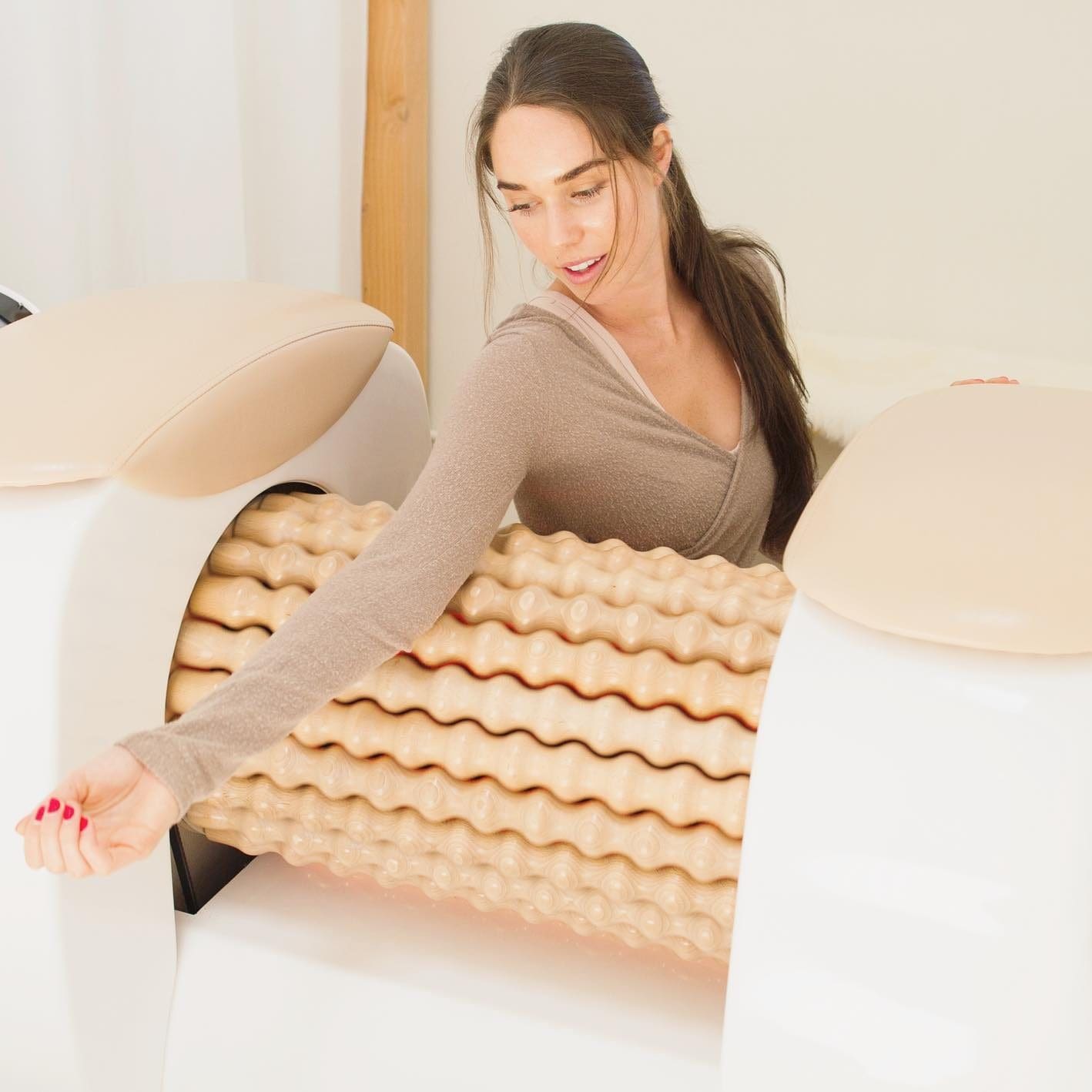 New to the Valley, Body Roll Studio is now open in Scottsdale. Similar to massage — but with a kick, Body Roll is a stationary and contactless workout (said to burn 350+ calories per session) offering muscle tension relief through private machine-based foam roller sessions. More intense than foam rolling at home; think of it as you and the machine. You are in control of areas that need relief by straddling, sitting, adjusting your body on a large cylinder made of wavy, wooden bars that rotate as you lean in, applying pressure to parts of your body to release tension and loosen fascia (connective tissue) where desired. Curtains provide a private experience throughout the 45-minute sessions while monitors guide you into poses to target calves, quads, arms and more. Infrared light adds a touch of heat to enhance the recovery process and stimulate the circulatory system. Memberships are available for those who want to get their roll daily; the Scottsdale studio is offering a single-session introductory roll for $45.