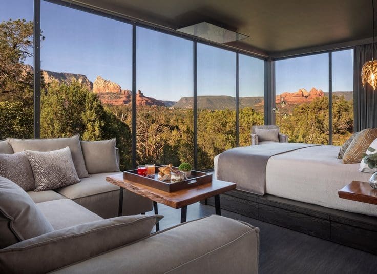 Situated in the National Forest of Sedona, all atriums in the property offer the same 576-square-foot king accommodations. However, the dramatic 360-degree views vary drastically as each atrium has been expertly placed to maximize view corridors.