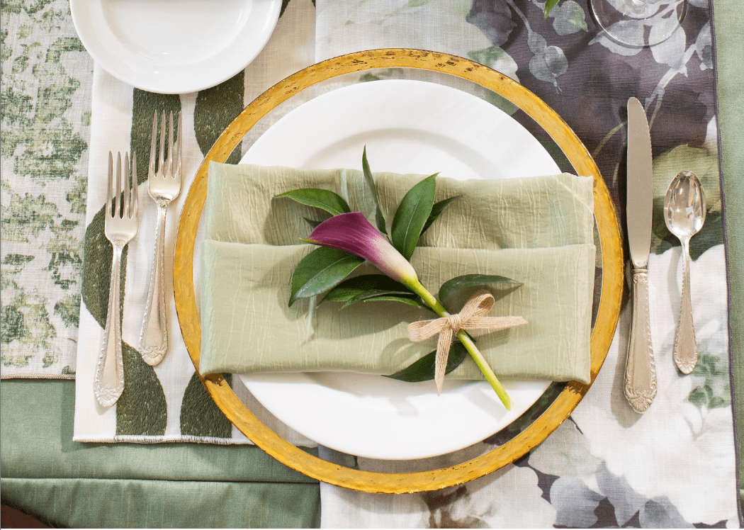 Dennis Says: This is basically a concept that you can mix and match. I don’t need to do patterns on all tables because I think it gets to be too much in a room. So, I like to do solids and accent them with a pattern. I was trying to do interchangeable things, where you could switch out any item you wanted if you wanted more of a contemporary look or more of a traditional look. And green isn’t neutral — it goes with everything, any time of the year.