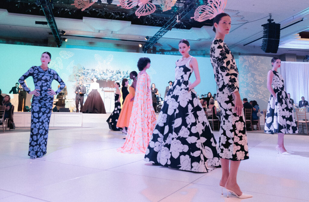 Notable Moments: The spring evening started with a lovely outdoor cocktail reception and the signature fashion show under the stars. The Carolina Herrera designs evoked style and grace as bold colors, black and white dresses, polka dot fabrics and delicate florals were modeled on the runway in many forms. Next, attendees entered the ballroom to be surrounded by butterflies above the dance floor and tables of all shapes and sizes coated in light blue hydrangeas. The theme for inspired giving was training women in need with skills in the tech industry, and it truly resonated with the audience. The overwhelming support of Wes Gordon was incredible — he upped the chance to win $5,000 in credit towards a gown TWICE, then two seats with a VIP experience at the next New York Fashion Week show if the audience could raise over $125,000 by donating $1,000 each. Needless to say, the goal was met, and three lucky winners were drawn from the pile of bid cards!