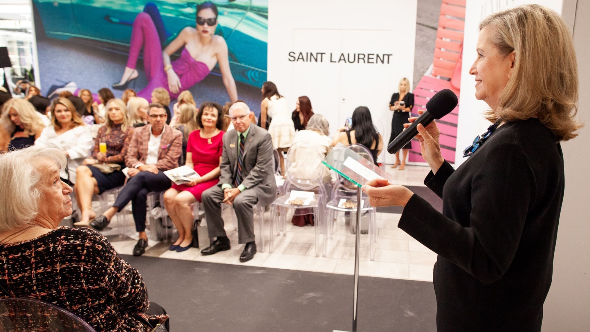 Notable Moments: Guests mingled, and enjoyed breakfast bites and mimosas while bidding on the luxury raffle offerings in the Neiman’s Couture Salon prior to the program and fashion show. Before the runway show, Dr. Jeffrey Trent (president and research director for TGen) shared details about the important new scientific methods being created by the organization to aid early detection and diagnosis of cancer in women. The fall fashions on the runway did not disappoint!