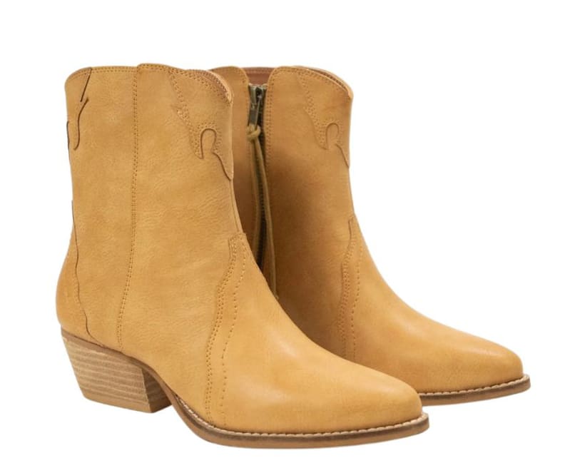 This bootie is a twist on the traditional cowboy boot. Paired with skirts, dresses and denim, the unexpected neutral, caramel color wears well with a variety of wardrobe choices.